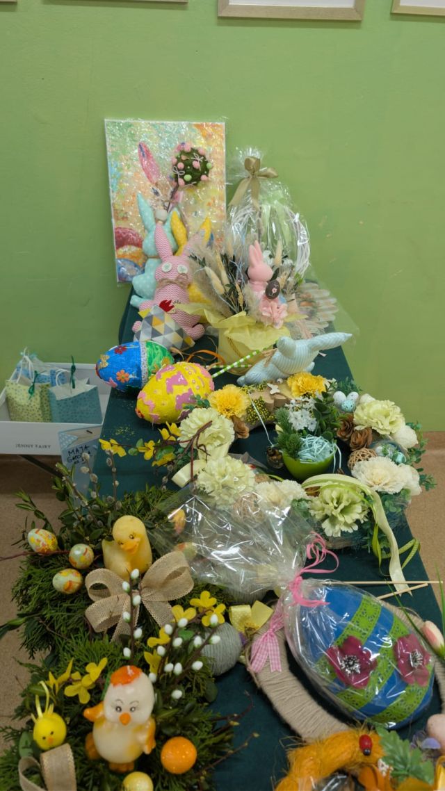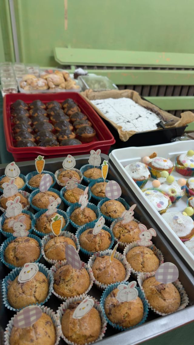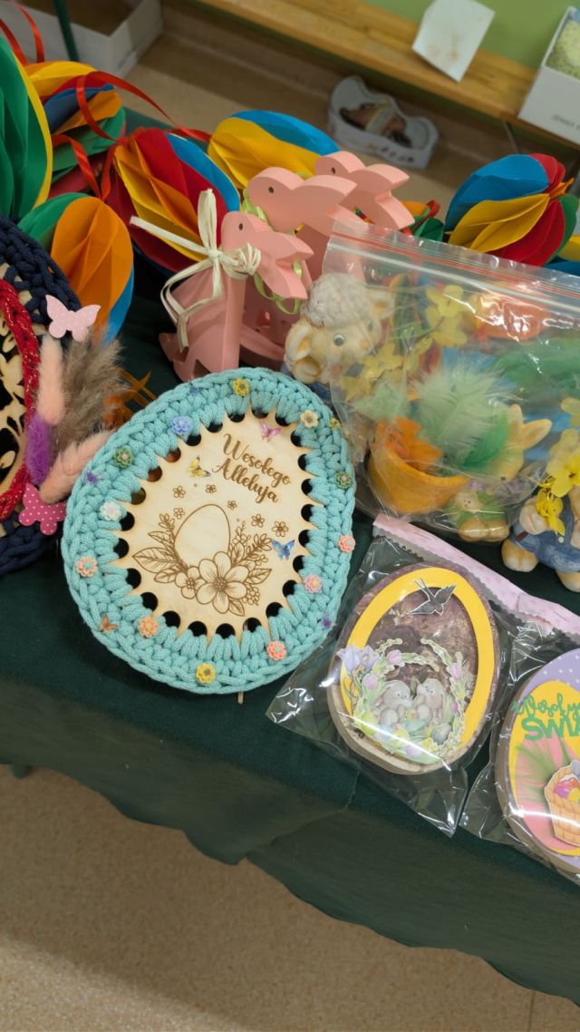 Na stoiskach można było znaleźć piękne, ręcznie wykonane ozdoby świąteczne przygotowane przez uczniów oraz ich rodziców. Kolorowe pisanki, stroiki, kartki wielkanocne i wiele innych dekoracji, które zachwycały pomysłowością i starannością wykonania. Każdy mógł znaleźć dla siebie coś wyjątkowego. Nie zabrakło również słodkich przysmaków. Odwiedzający kiermasz mieli okazję spróbować pysznych ciast, babeczek, mazurków oraz innych domowych wypieków, które znikały ze stołów w mgnieniu oka. Aromat świeżych wypieków unosił się w całej szkole, tworząc niezwykle przyjemną atmosferę.