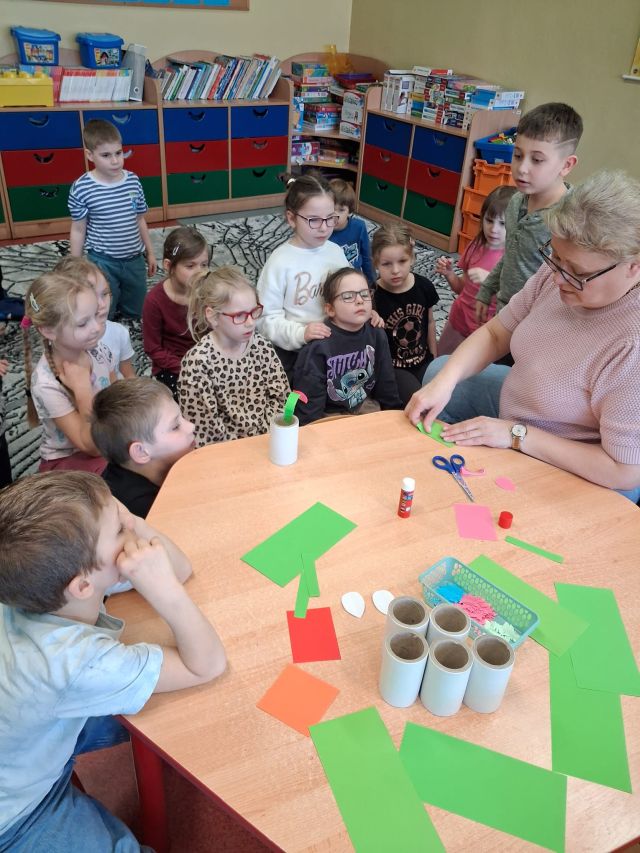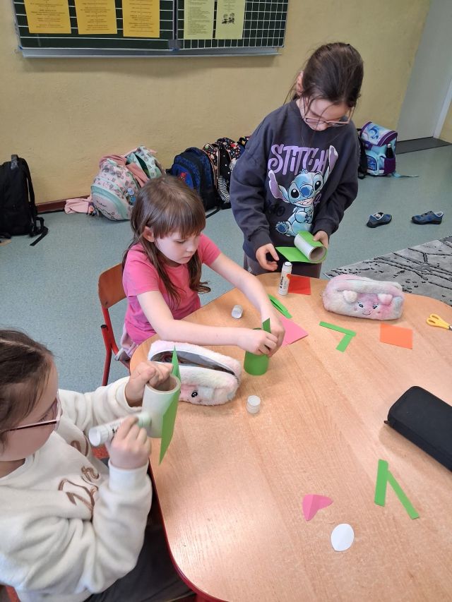 W tygodniu poprzedzającym Dzień Kobiet w świetlicy szkolnej odbyły się zajęcia plastyczne. Celem spotkania było przybliżenie dzieciom znaczenia tego święta oraz rozwijanie ich kreatywności i zdolności manualnych. Podczas zajęć uczniowie rozmawiali o tym, komu i dlaczego składamy życzenia w Dniu Kobiet. Następnie wykonali własnoręczne prace plastyczne - kolorowe wazoniki z kwiatkami, które mogli podarować swoim mamom, babciom lub innym bliskim kobietom lub koleżankom.