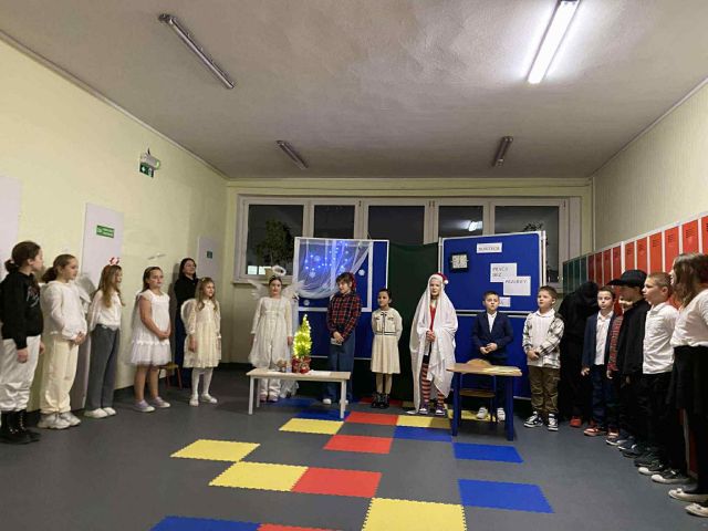 Ostatnie chwile w szkole tuż przed Świętami Bożego Narodzenia upłynęły pod znakiem scen bożonarodzeniowych i śpiewania kolęd. W auli szkolnej w czasie przerw lekcyjnych czekali na uczniów: Józef, Maryja z Dzieciątkiem oraz anioły (w tych rolach uczniowie klas III d i IV c). Uczniowie, którzy przyszli zobaczyć Małą Dziecinę wzięli udział w rozmowie o historii narodzenia Jezusa i zaśpiewali swoje ulubione kolędy. Chętni zrobili pamiątkowe zdjęcia.